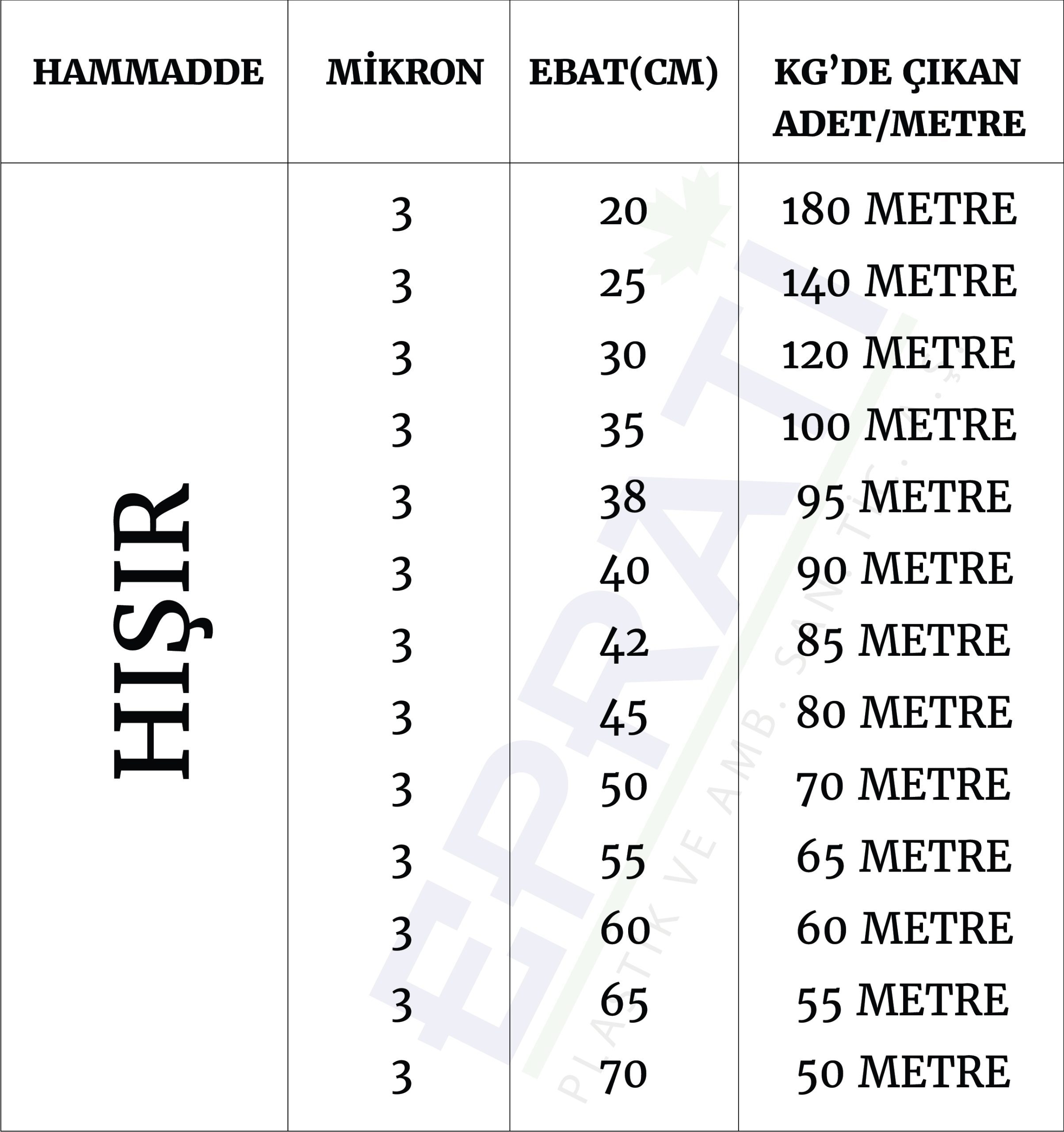 Halı poşetleri ortalama 30 kilogramlık sonsuz rulolar şeklinde ve aşağıdaki standart ölçü ve metrajlarda sunulmaktadır.